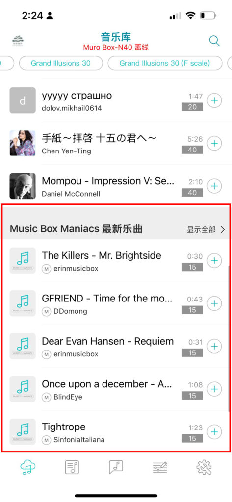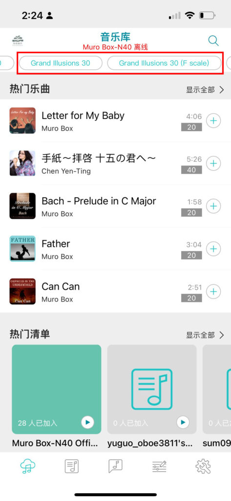 在Muro Box App 音乐库中有专属 MBM 网站最新乐曲栏位,每小时与MBM网站同步更新,点击上方音域选择按钮,可筛选出符合的歌曲,