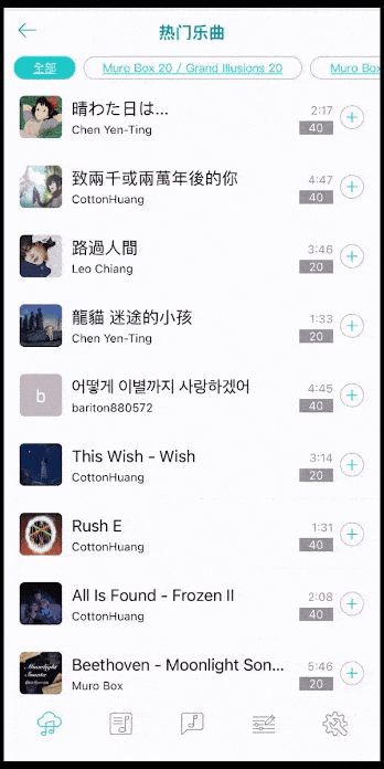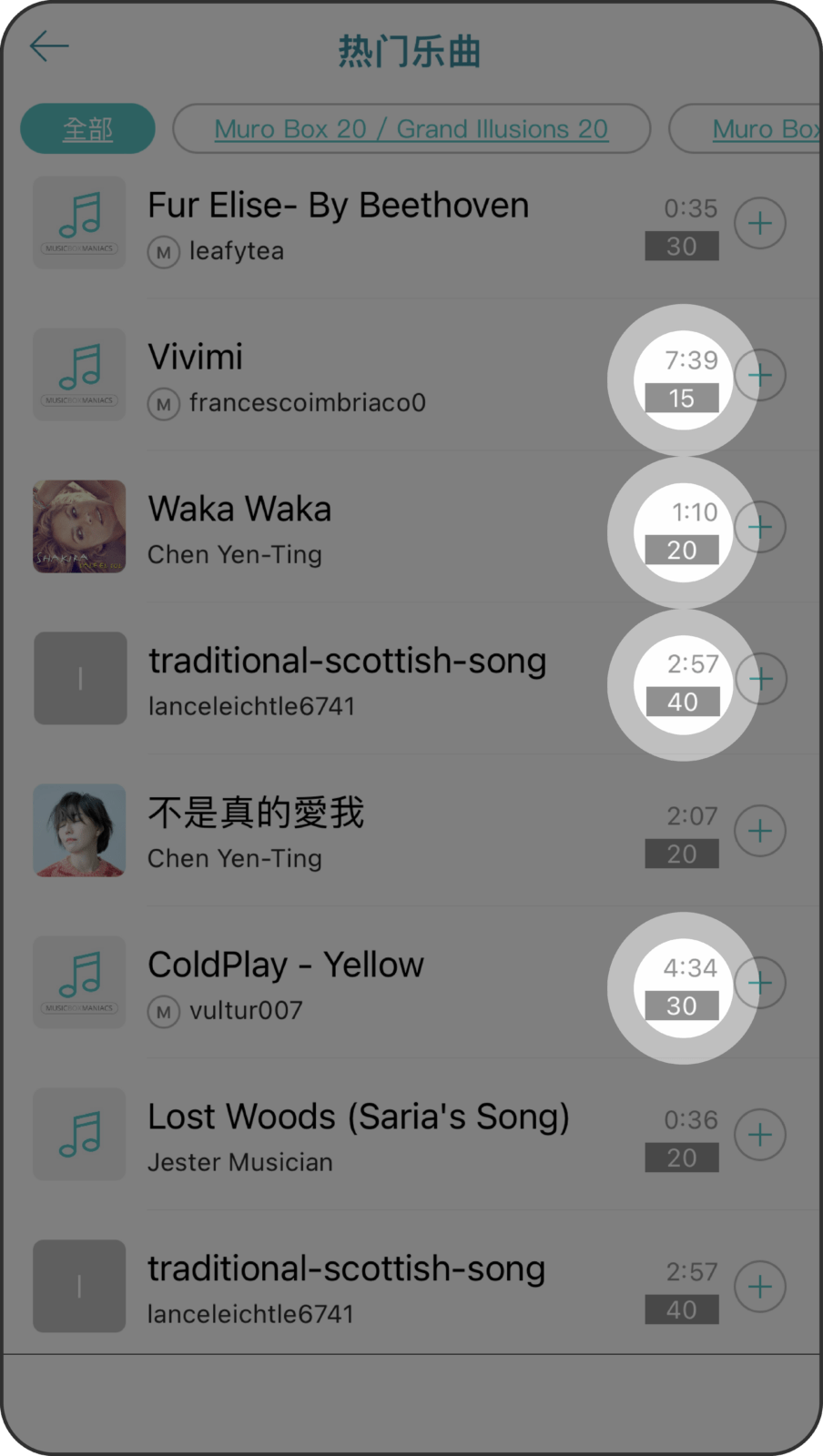 *请注意*目前曲库的歌曲旁标有小数字,代表不同音域的编曲,请对应您购买的版本来选歌:
