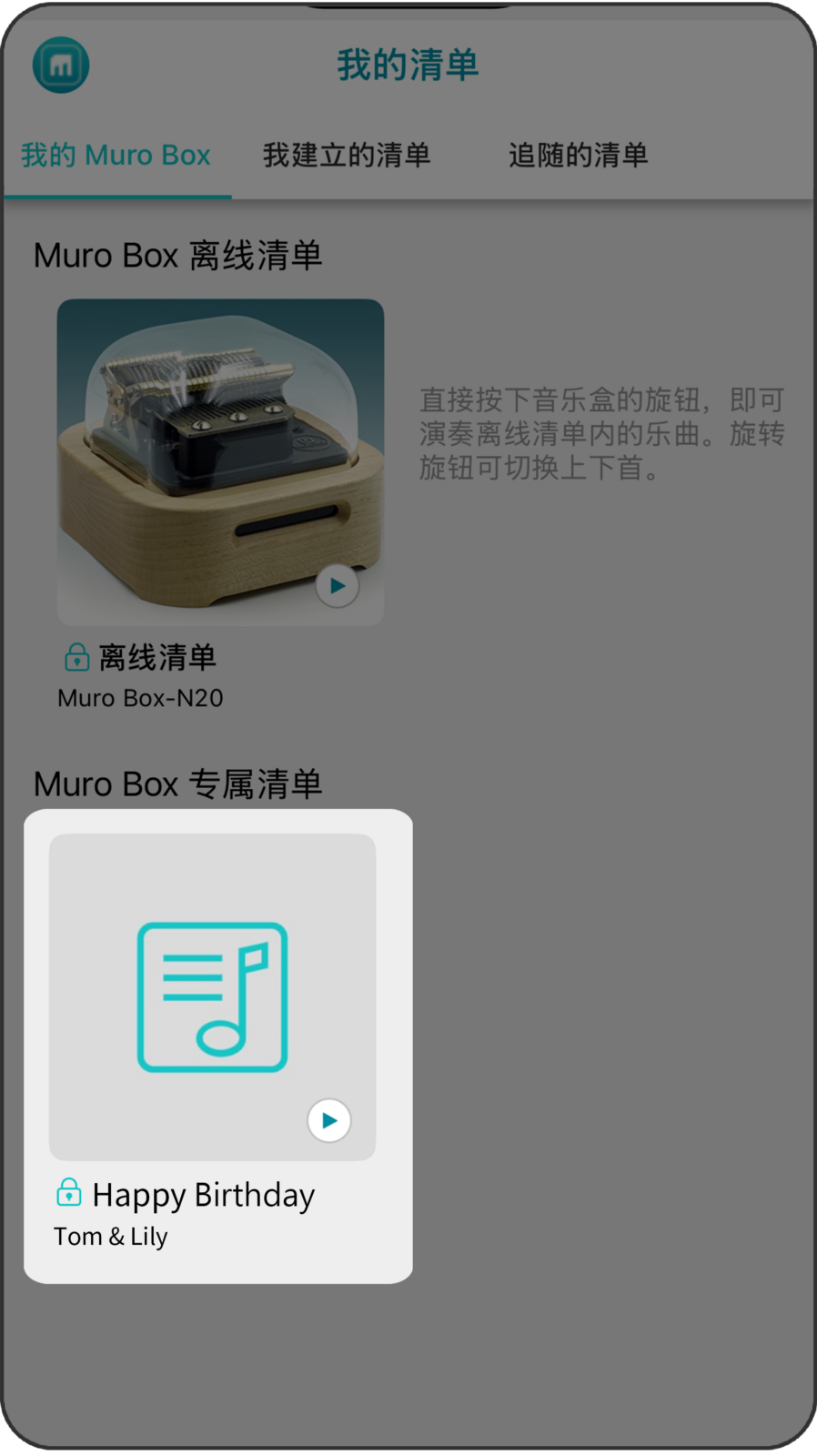 收礼者拿到 Muro Box 时,即使没有连接 APP,也能离线播放您指定的歌单。当音乐盒连上 APP,这份客制化歌单会显示在列表中,让收件者感受到您透过音乐、图像和文字传递的心意。