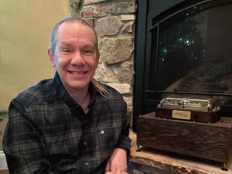 Brandon Parkhurst photographed his Muro Box-N40 Sublime music box (made of Acacia wood) and the N40 resonance box (made of Millettia Laurentii wood, whose Chinese name means “Chicken wing wood”) in front of the fireplace at his home in the United States.