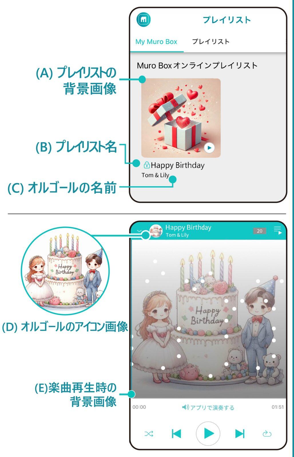 8文字以内(スペースや句読点を含む)。ご指定がない場合、「本オルゴールの専用プレイリスト」と表示されます。