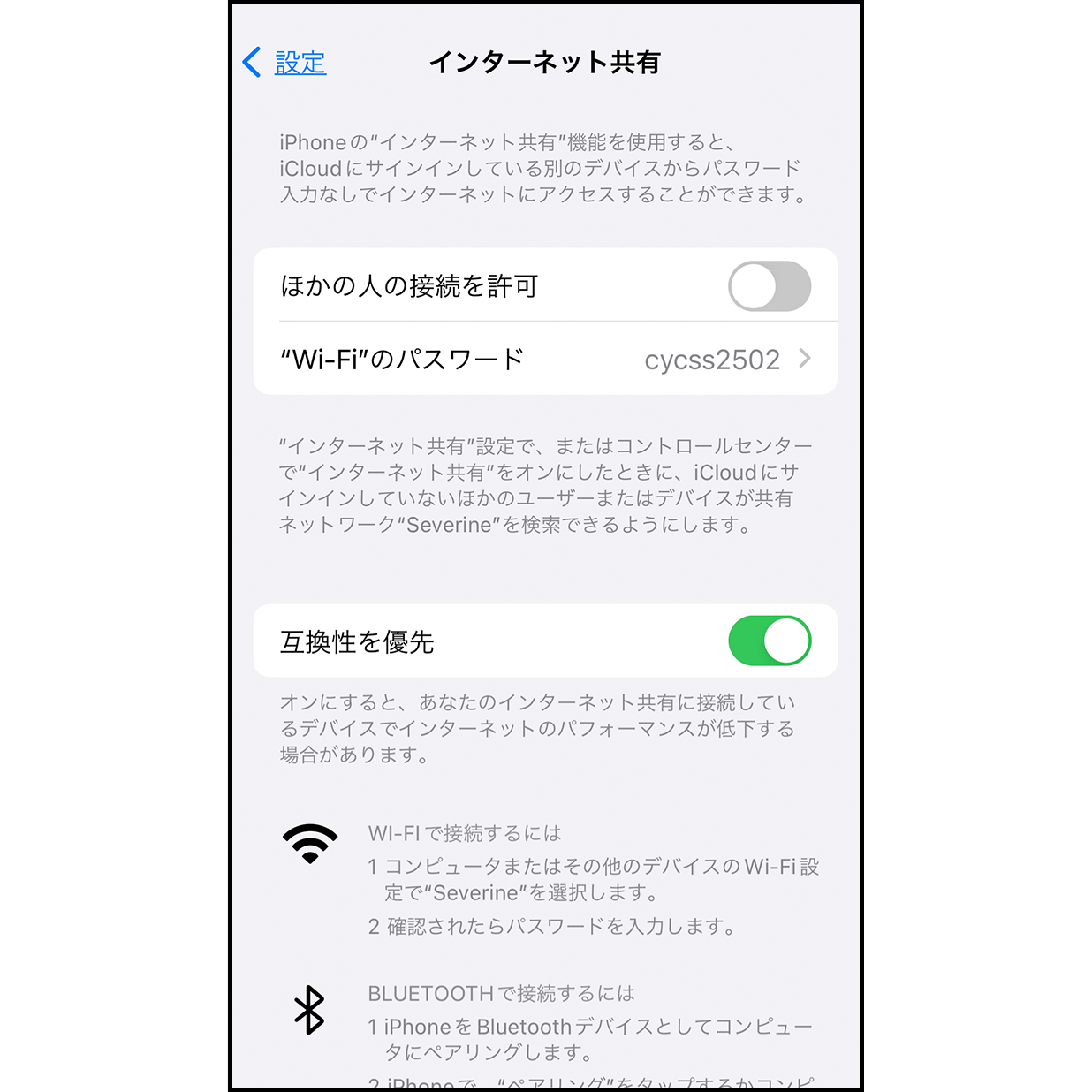 iPhone 12をご利用の場合は、[インターネット共有]>[互換性を優先]をオンにしてください。これにより、Muro BoxがiPhoneのホットスポットに接続できるようになります。
