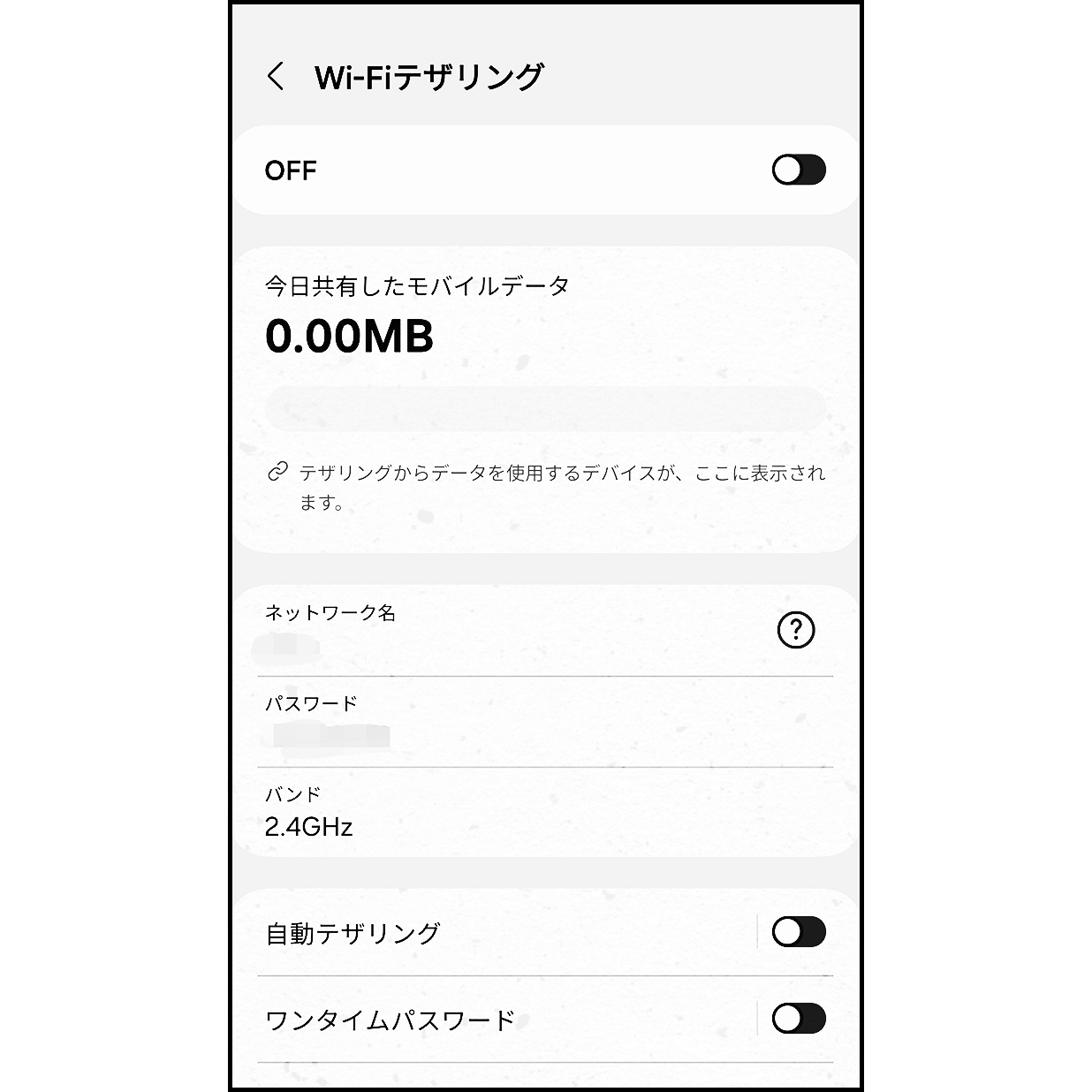 設定画面でAndroidのホットスポット名とパスワードを設定し、一旦ホットスポットをオフにします(パーソナルホットの設定方法)