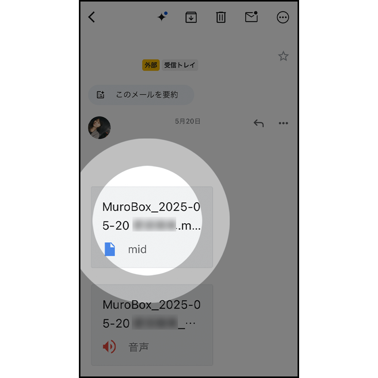 メール受信箱から、MIDIファイルが添付されたメールを開きます。
