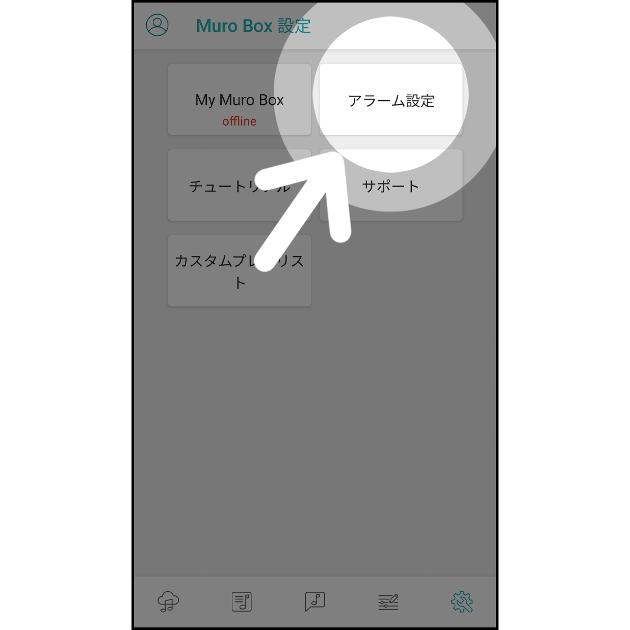 13. アラーム設定 1.アラーム設定を入力 Muro Boxアプリの設定画面から、「アラーム設定」を選択2.新規「演奏時間」を作成 右上の「+」をクリックします。3.「演奏時間」の設定 名称、開始/終了時間、リピート設定、プレイリスト、再生時間を編集し、右上の「 ✓ 」ボタンを押せば完了です。4.「アラーム設定」を完了 右側にあるスイッチで、いつでもアラームをオン、オフにできます。