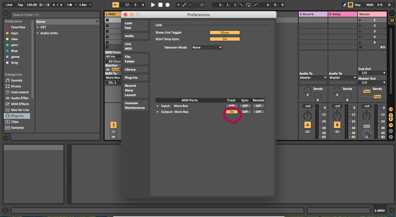 2. 「MIDI To」のドロップダウンメニューを開き、「Muro Box」を選択します。