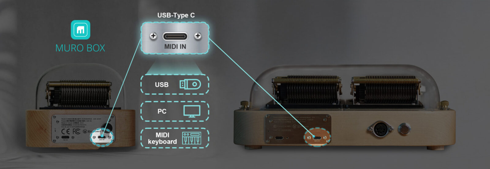 N40 サブライム版 / N40 標準版 | ケーブルの両端をPCとオルゴールのUSB-C MIDI入力端子に接続します。接続が成功すると、オルゴールが通知音を鳴らします。