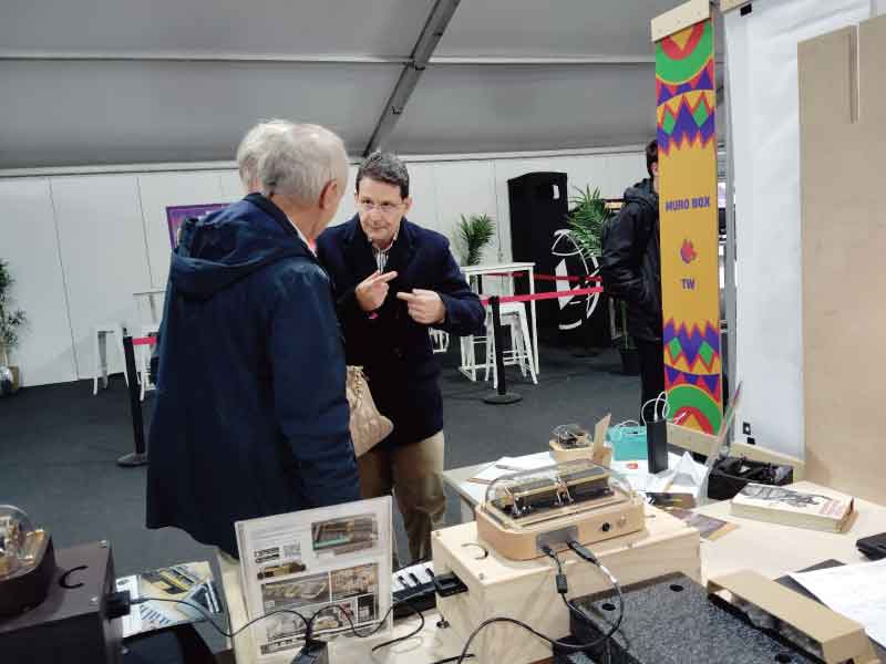 Siegfried站在2025 KIKK Festival展會活動的Muro Box攤位前,用法文熱情講解傳統音樂盒只能重複演奏單曲的機構,怎樣改良成活動式凸點設計的可編曲自動演奏樂器。