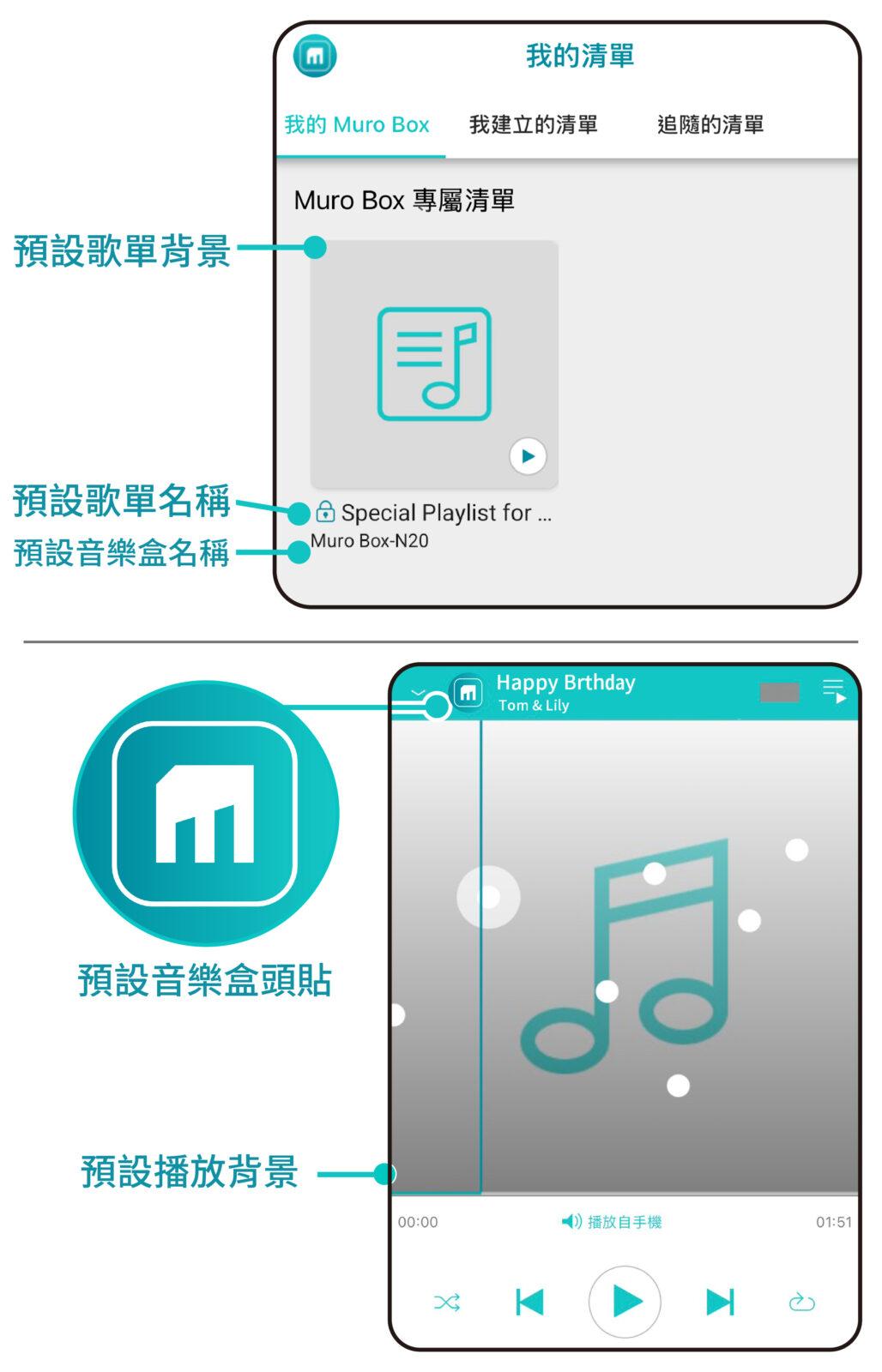 (此歌單是指開箱後插電,按下旋鈕播放的歌單。如需加入更多歌曲到離線歌單,或者更新其中曲目,您會需要先將Muro Box音樂盒與它專屬的免費App透過網路連線,即可自行調整離線歌單內容與歌曲排序。)