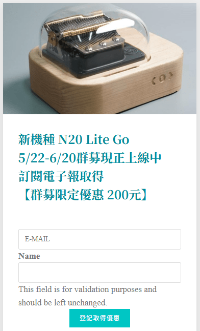 實際執行的方式,是我們在官網建立了一個產品簡介頁面,並將有興趣的顧客引流到這裡。如果他看完產品介紹並感到有興趣,我們就會請他留下email,以獲取未來正式集資頁面上 200 元的折價券。